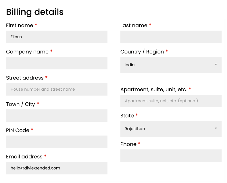 Create a customized checkout form on your store using the Divi WooCommerce Checkout Manager. It’s an easy-to-use Divi WooCommerce extension that allows you to hide or show checkout form fields. Plus, you can change their layout, apply custom labels, and more.